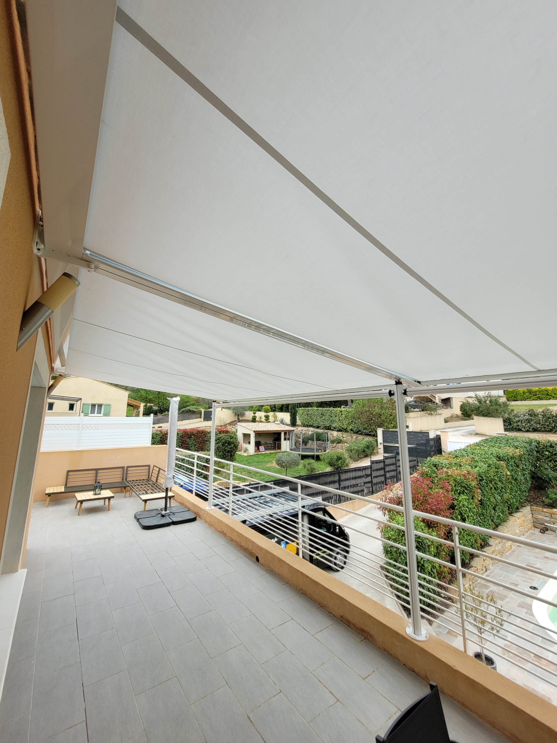 Le tissu beige a été sélectionné pour sa teinte douce, intemporelle et particulièrement adaptée aux paysages de Bandol. Ce coloris apporte immédiatement chaleur et élégance à la terrasse, tout en créant un espace ombragé confortable.