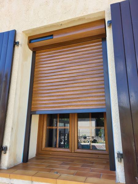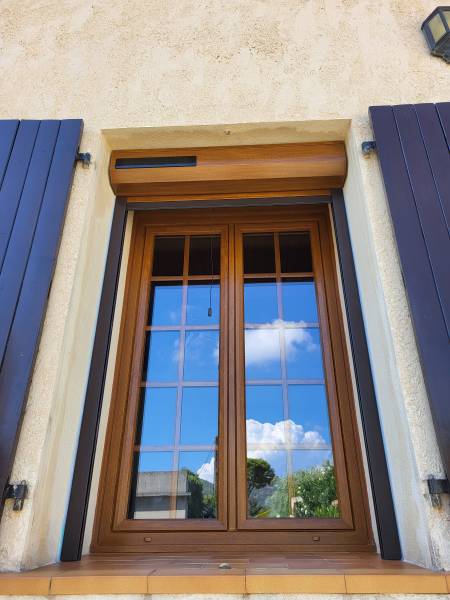 Installation de volets battants bleus et de volets roulants couleur bois dans une maison à La Ciotat
