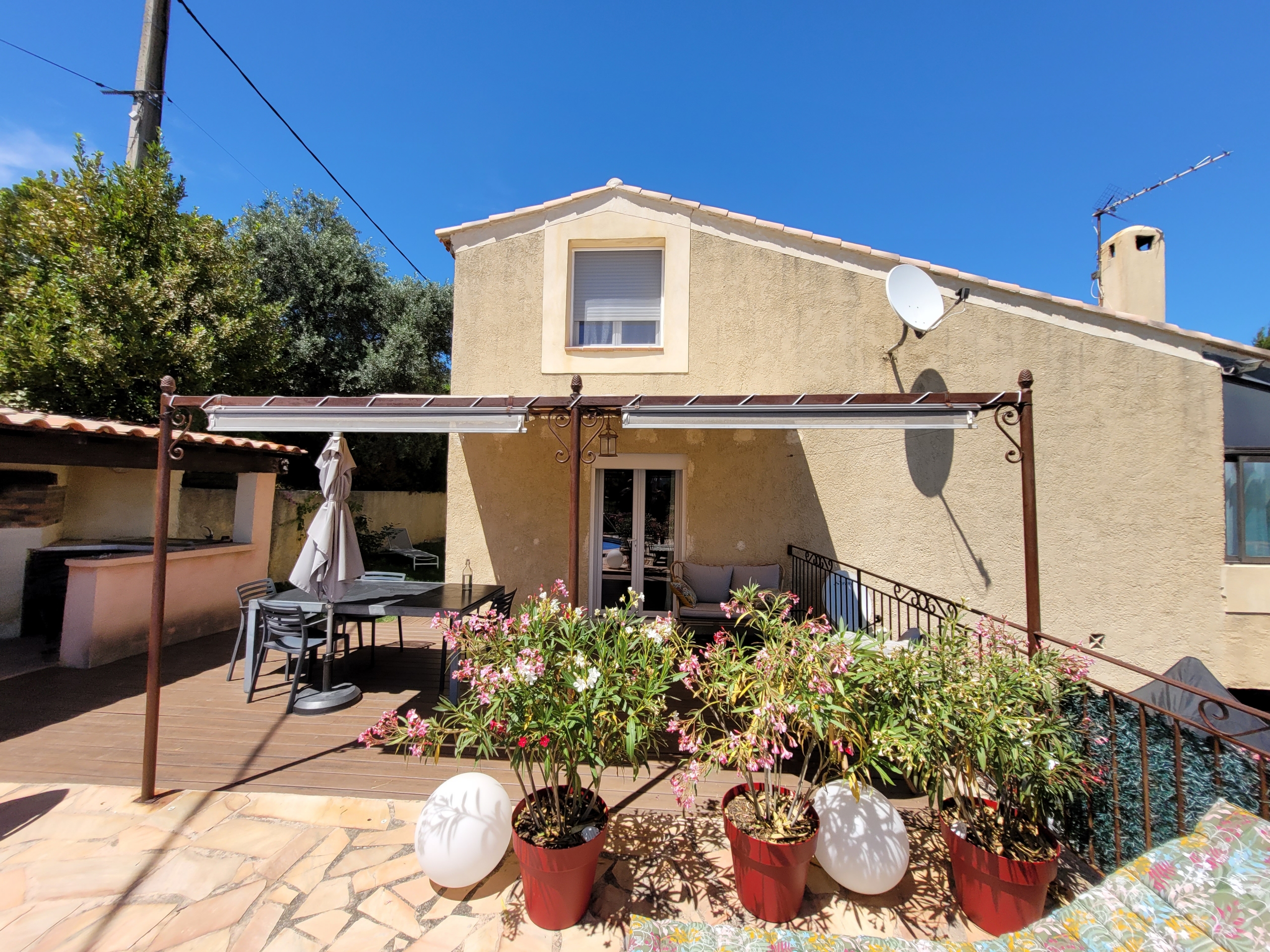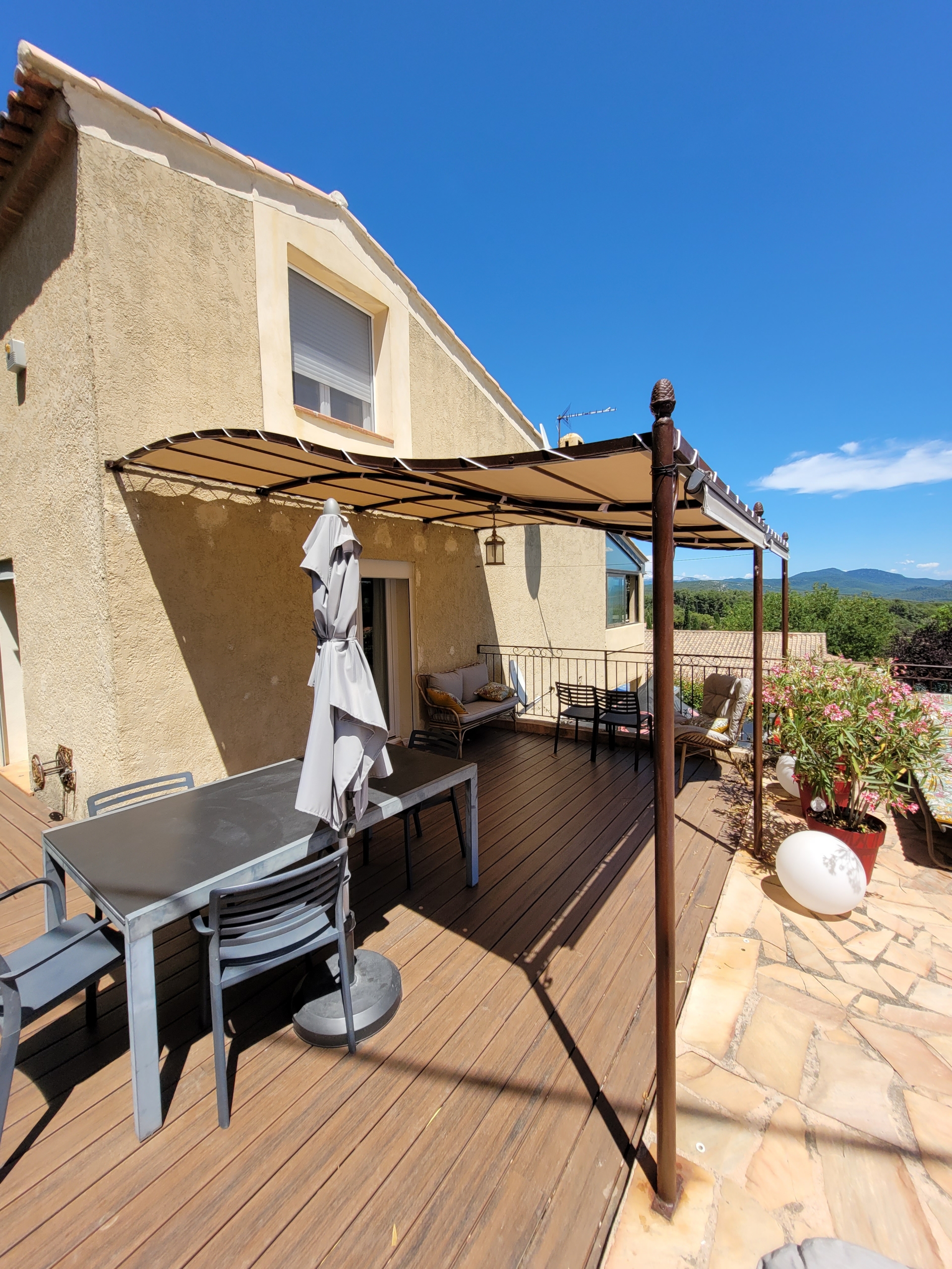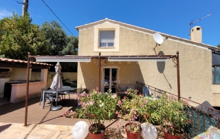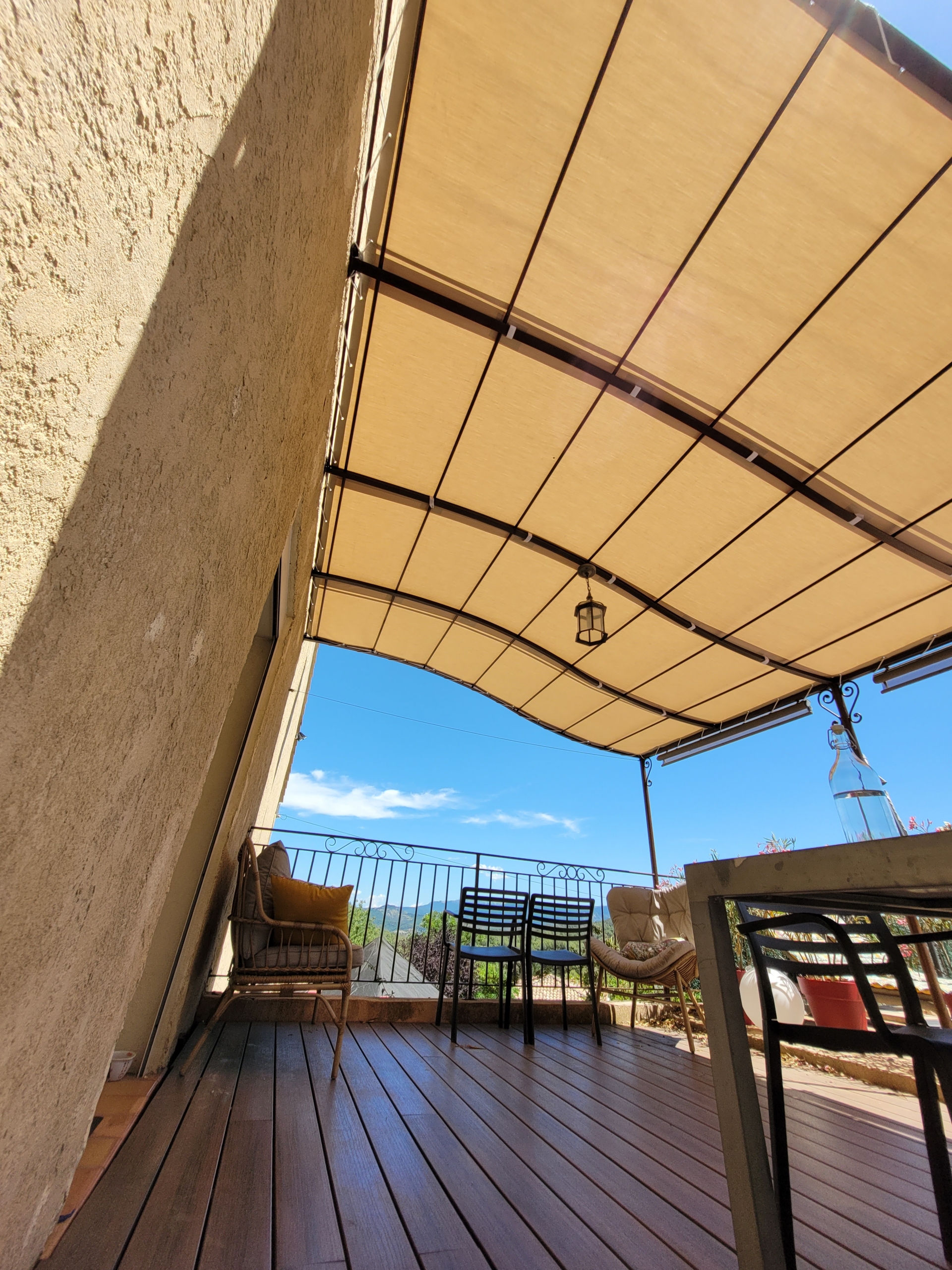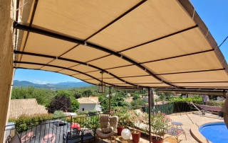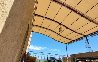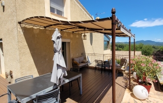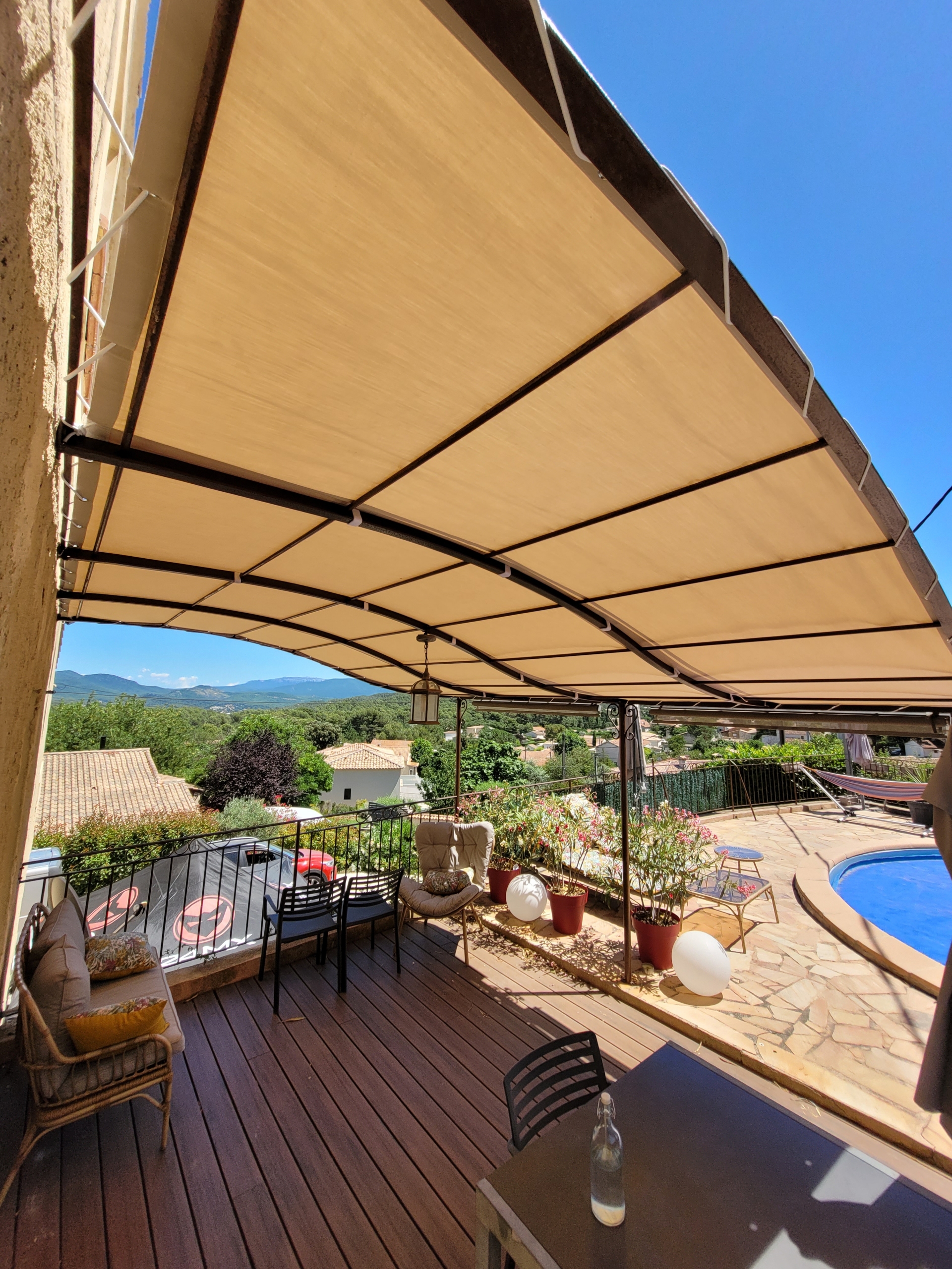 Installation d’un store banne manuel beige dans une maison : une solution élégante et pratique signée EB-Design